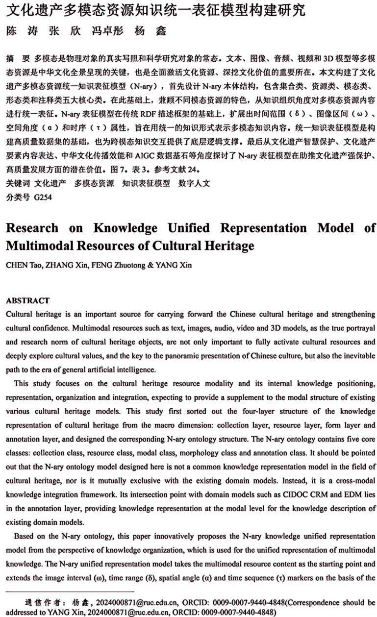 近日,18禁直播 陈涛副教授指导学生张欣、冯卓彤、杨鑫的论文《文化遗产多模态资源知识统一表征模型构建研究》在《中国图书馆学报》网络首发。