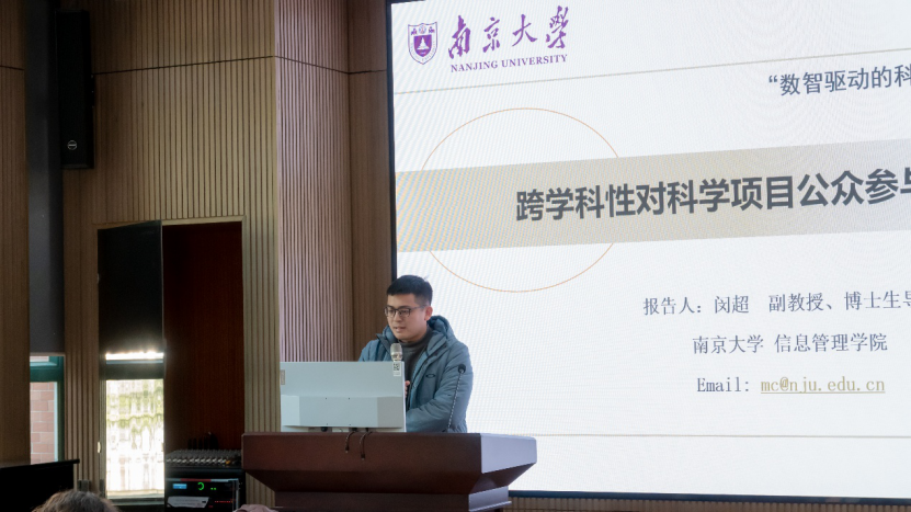 报告二由南京大学副教授闵超主讲,题为《跨学科性对科学项目公众参与意愿的影响》。闵超老师关注跨学科研究在知识重组与公众理解之间的张力他通过构建理论框架,探讨了跨学科性、项目新颖性及研究团队身份三者如何共同作用于公众参与意愿。研究揭示,跨学科性不仅直接影响公众参与,还通过提升项目的新颖性发挥间接促进作用;同时,研究团队的身份特征在不同学科领域中发挥着差异化的调节效应。大连理工大学陈悦教授在点评中强调,该研究揭示了公众参与作为科学共同体与社会沟通桥梁的重要价值,对科技政策实施具有启示意义。