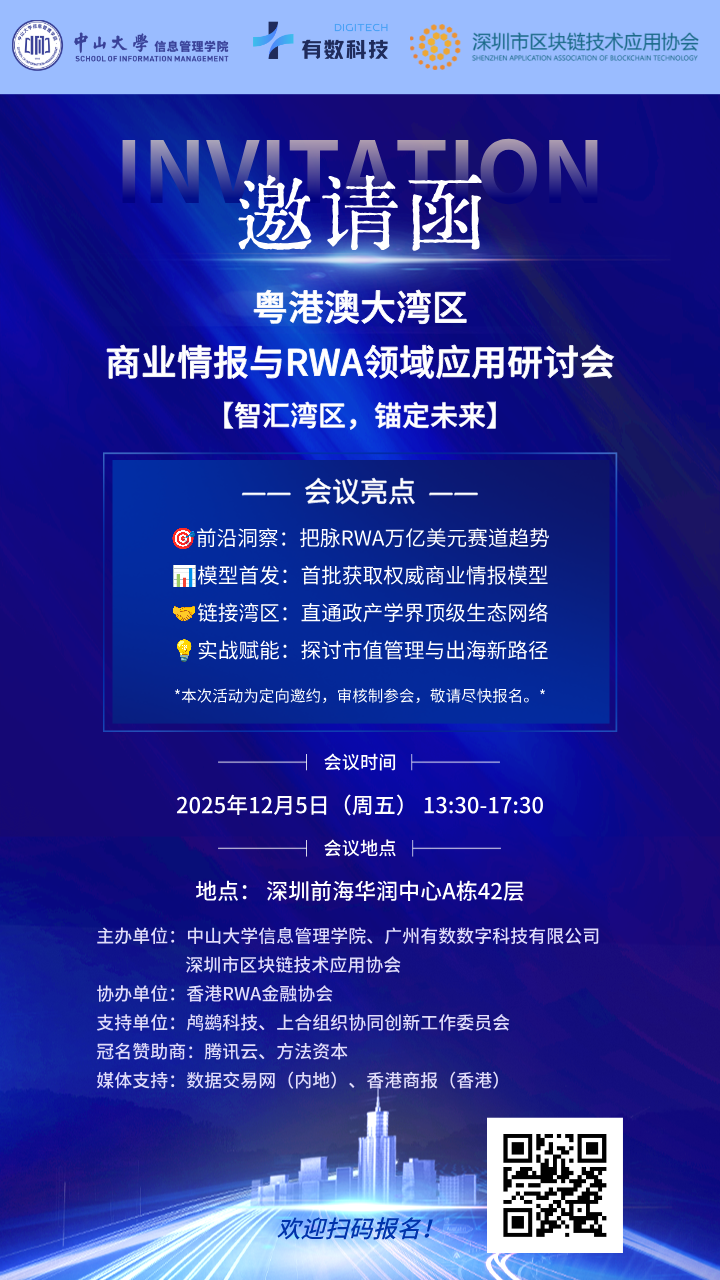 2025年,现实世界资产(RWA)正从概念验证迈向规模化应用,成为连接传统金融与数字经济的核心桥梁。RWA的代币化,正通过区块链与人工智能技术,深刻重塑全球资本配置与商业情报分析的范式。在这一产业爆发窗口期,由18禁直播 、广州有数数字科技有限公司、深圳市区块链技术应用协会联合主办的“粤港澳大湾区商业情报与RWA应用研讨会” 即将在深圳前海启幕,为行业搭建深度交流与资源对接的核心平台。本次研讨会旨在汇聚学术界、产业界与政策制定者的智慧,共同探索全球商业情报分析的新方法论与RWA的应用场景,从而推动产学研用深度融合、促进行业生态共建。