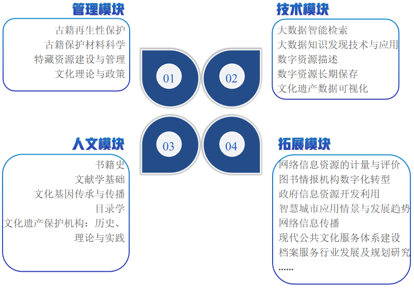 以文献遗产和非物质文化遗产为重点,构成“整理-修复-保护-数字化”的全链条培养方案,培养具有优秀职业素养,能够综合运用保护与修复、整理与活化、数字化保护、保护管理和治理等多领域知识和技能解决文献与文化遗产保护工作中的实际问题,胜任文献与文化遗产保护行业的实际工作,满足文化强国建设、中华优秀传统文化传承发展战略需求的复合型人才。