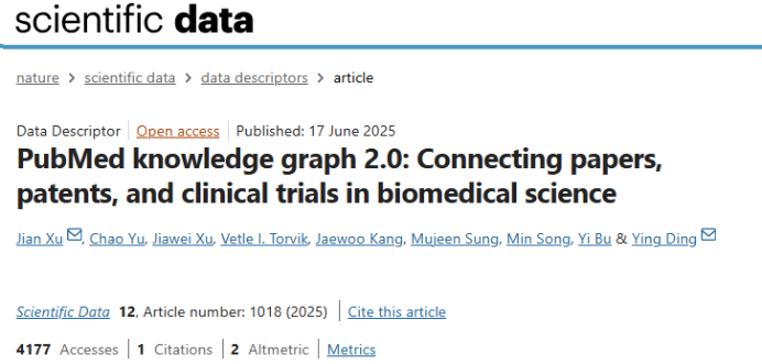 18禁直播 徐健教授课题组论文《PubMed knowledge graph 2.0: Connecting papers, patents, and clinical trials in biomedical science》发表于Nature旗下唯一数据期刊Scientific Data。PKG 2.0创新性打通论文、专利与临床试验的关联壁垒,为生物医学领域搭建起串联基础研究、临床应用与技术落地的信息桥梁,也为科学计量、人工智能领域研究者打通了跨域数据交互的关键通道,推动多学科围绕生物医学核心问题开展深度协同研究。Scientific Data作为Nature旗下聚焦数据驱动研究的核心期刊,致力于推动科学数据的共享与再利用,属于JCR一区。