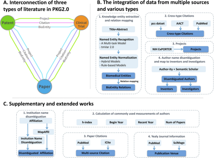 PubMed Knowledge Graph 2.0(PKG 2.0)首次在生物医学领域实现了论文、专利与临床试验三类关键科学资源的大规模、细粒度整合,打破了三者长期分散存储于不同数据库、遵循各异管理标准与数据格式的壁垒——通过构建涵盖超3600万篇论文、130万项专利、48万项临床试验的庞大知识图谱,依托4.82亿个生物医学实体链接、1900万个引用链接及700万个项目链接,将原本孤立的学术成果、技术转化与临床应用数据串联成有机整体;同时,其创新融合的细粒度生物医学实体提取技术、高性能作者姓名消歧算法、多源引用整合方案,以及对美国国立卫生研究院(NIH)高质量项目数据的有效纳入,不仅解决了生物医学多源数据整合中的核心技术难题(如作者身份混淆、实体关联模糊等),更通过严格数据验证确保了关键任务的高准确性;此外,该图谱作为开放可用的高质量数据集,为生物医学研究人员追踪成果转化路径、文献计量学者分析领域发展趋势、文献挖掘研究者开发新算法模型提供了前所未有的数据支撑,有力推动了生物医学领域从“数据分散”向“知识关联”的跨越,为跨模态、跨领域的生物医学知识发现奠定了基础。