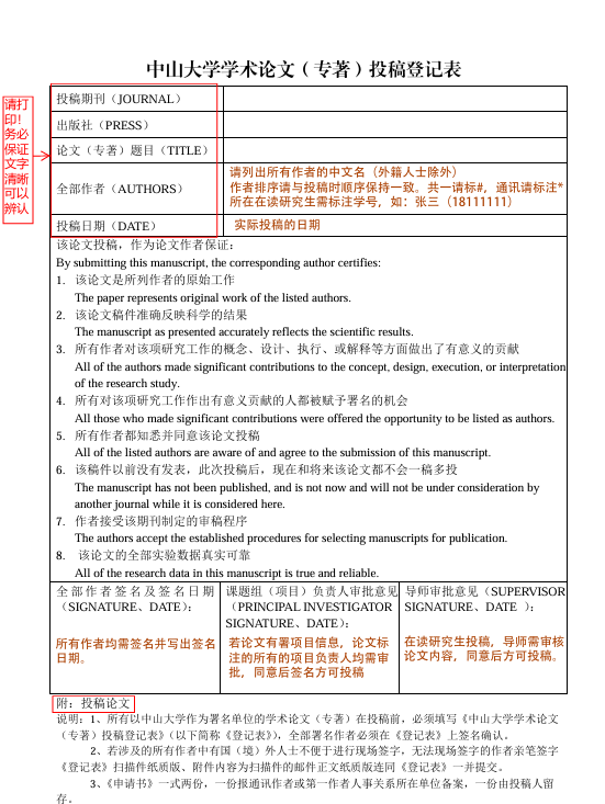 根据《18禁直播 预防与理学术不端行为办法》(中大研院[2019】315号)要求,2019年10月31日之后发表的论文(专著),须同步提交签名版《18禁直播 学术论文(专著)投稿登记表》扫描件或填写论文备案平台备案号作为佐证材料。
