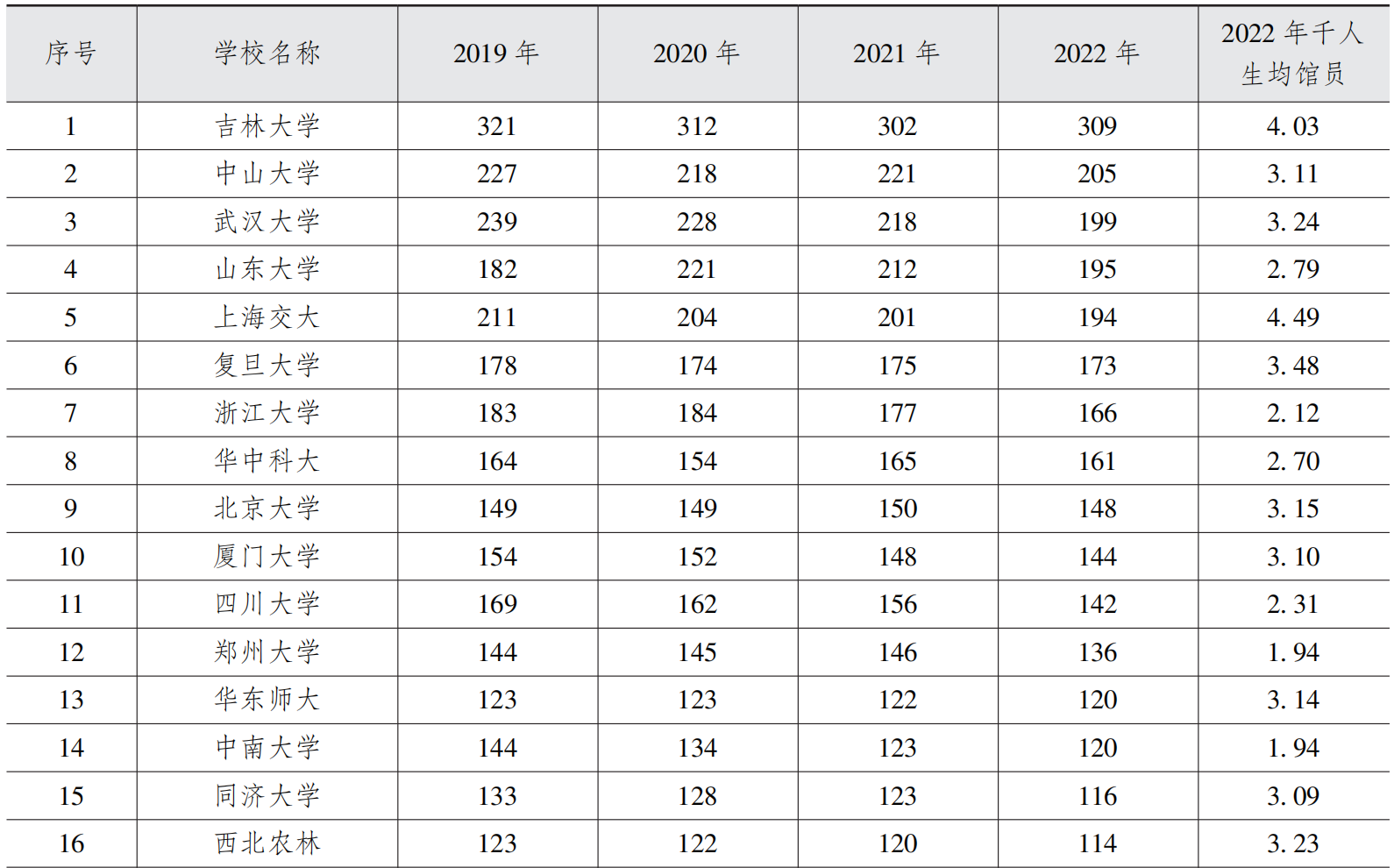 表5 中国一流大学图书馆在编职工人数统计(2019—2022 年)(部分)