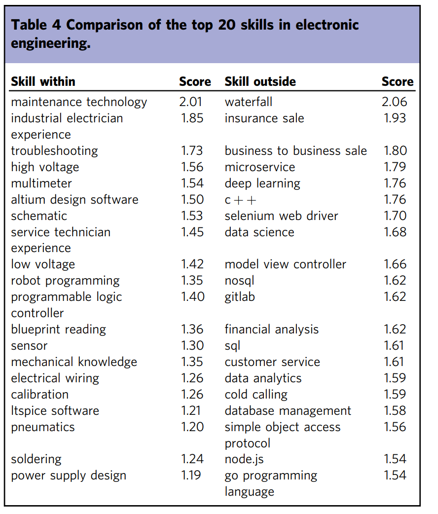 能力层面,学科领域内、外就业所需要具备的能力之间存在差异。图书馆学与放射学的专业能力在本领域至关重要,但对于跨领域就业的从业者来说,客户接待与商品推销等软性技能更有助于实现职业拓展的目标。语言学与电子工程学领域的专业能力不仅在本领域至关重要,在领域之外的职业中的适用性也较强。