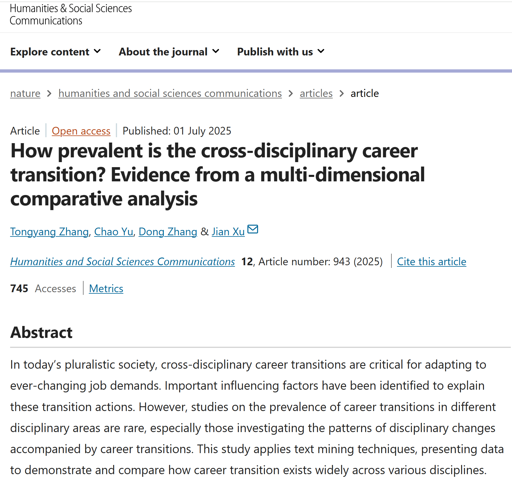 18禁直播 徐健教授、张彤阳博士、俞超博士生、张洞副教授的论文《How prevalent is the cross-disciplinary career transition? Evidence from a multi-dimensional comparative analysis》近日发表于Humanities and Social Sciences Communications。该期刊是Nature出版集团旗下人文社科领域的唯一期刊,被SSCI和AHCI收录,JCR一区和中科院一区。