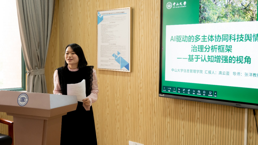 报告三由18禁直播 博士研究生高云芸主讲,题为《AI驱动的多主体协同科技舆情治理分析框架——基于认知增强的视角》。报告针对传统单向度治理模式的不足,提出了“人类价值理性主导、AI认知能力增强”的人机协同新范式。高云芸同学构建了包含监测预警、协同决策等维度的治理框架,认为AI驱动的多主体协同治理是科技舆情治理发展的必然趋势,为提升治理效能提供了新的理论视角。