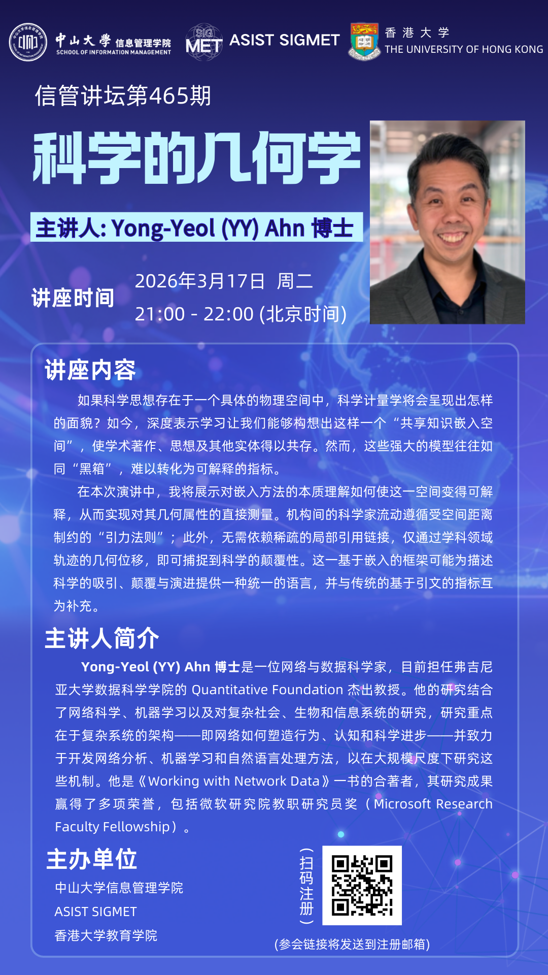 如果科学思想存在于一个具体的物理空间中,科学计量学将会呈现出怎样的面貌?如今,深度表示学习让我们能够构想出这样一个“共享知识嵌入空间”,使学术著作、思想及其他实体得以共存。然而,这些强大的模型往往如同“黑箱”,难以转化为可解释的指标。在本次演讲中,将展示对嵌入方法的本质理解如何使这一空间变得可解释,从而实现对其几何属性的直接测量。机构间的科学家流动遵循受空间距离制约的“引力法则”;此外,无需依赖稀疏的局部引用链接,仅通过学科领域轨迹的几何位移,即可捕捉到科学的颠覆性。这一基于嵌入的框架可能为描述科学的吸引、颠覆与演进提供一种统一的语言,并与传统的基于引文的指标互为补充。